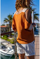 Kadın Kiremit Keten Omuz Dekolteli Salaş Bluz BST2923
